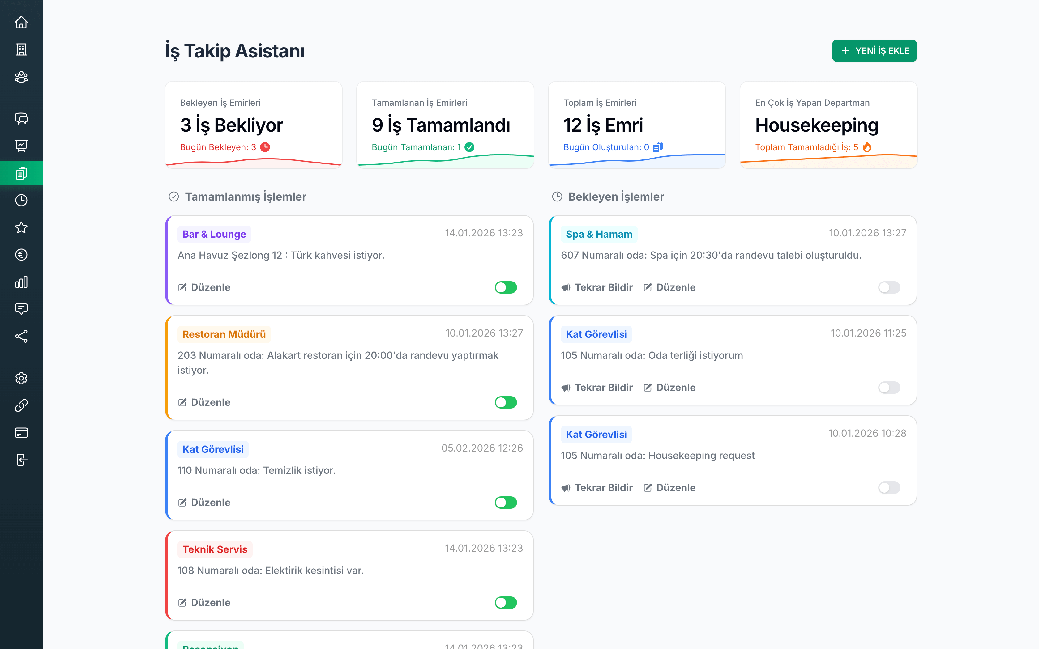 Hotel AI Job Trackings, departmanlar arası kağıt kalem trafiğini bitirerek tüm operasyonel süreci anlık ve dijital hale getirir.