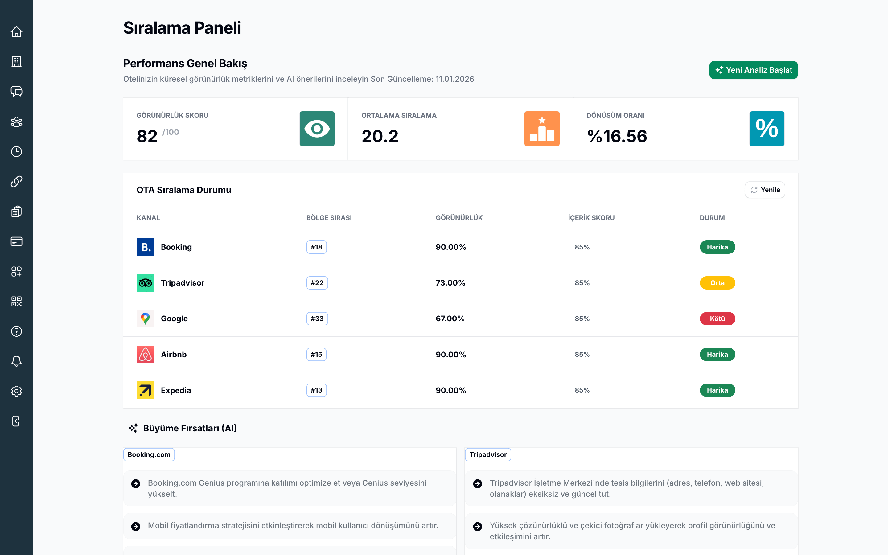 HotelAI Ranker, otelinizin Booking, TripAdvisor ve Expedia gibi platformlardaki görünürlüğünü analiz eder. Yapay zeka destekli algoritmalarımız, rakipleriniz arasından sıyrılmanız için size özel stratejik öneriler sunar.